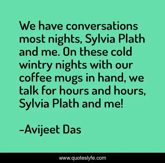 This page presents the quote "We have conversations most nights, Sylvia Plath and me. On these cold wintry nights with our coffee mugs in hand, we talk for hours and hours, Sylvia Plath and me!". Author of this quote is Avijeet Das. This quote is about coffee, nights, love, sylvia-plath, writers-on-thinking, conversations, valentines, wintry-night, poetry,.