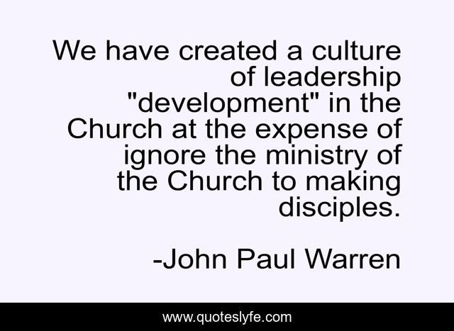 This page presents the quote "We have created a culture of leadership "development" in the Church at the expense of ignore the ministry of the Church to making disciples.". Author of this quote is John Paul Warren. This quote is about gospel, discipleship, grace, leadership, west-palm-beach,.