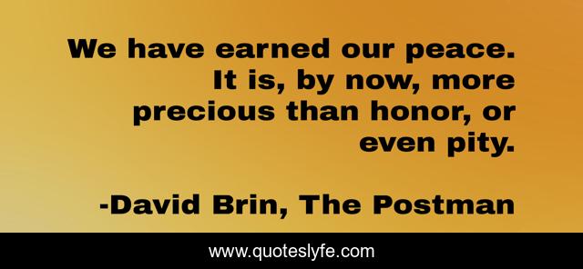 This page presents the quote "We have earned our peace. It is, by now, more precious than honor, or even pity.". Author of this quote is David Brin, The Postman. This quote is about just-desserts, peace, rest, reward,.