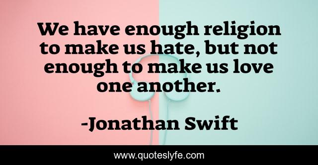 This page presents the quote "We have enough religion to make us hate, but not enough to make us love one another.". Author of this quote is Jonathan Swift. This quote is about love, enough, hate, affection,.