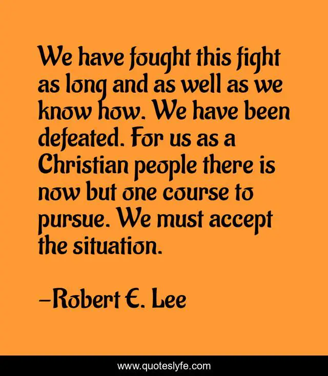This page presents the quote "We have fought this fight as long and as well as we know how. We have been defeated. For us as a Christian people there is now but one course to pursue. We must accept the situation.". Author of this quote is Robert E. Lee. .