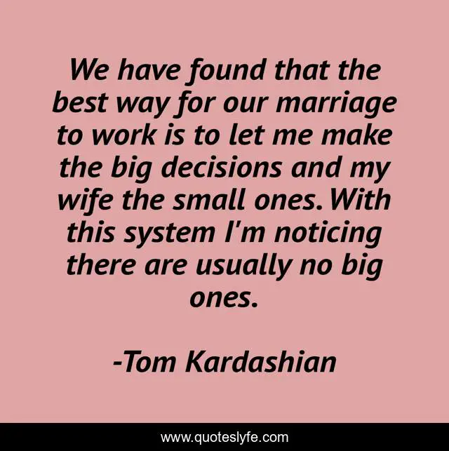 This page presents the quote "We have found that the best way for our marriage to work is to let me make the big decisions and my wife the small ones. With this system I'm noticing there are usually no big ones.". Author of this quote is Tom Kardashian. This quote is about love, marriage, affection,.