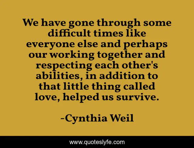 This page presents the quote "We have gone through some difficult times like everyone else and perhaps our working together and respecting each other's abilities, in addition to that little thing called love, helped us survive.". Author of this quote is Cynthia Weil. This quote is about working together, together,.