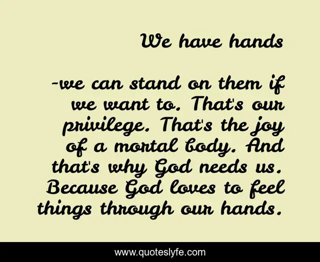 "we can stand on them if we want to. That's our privilege. That's the joy of a mortal body. And that's why God needs us. Because God loves to feel things through our hands. Quotes." Quoteslyfe.com, 2025. Fri. 05 Dec. 2025. <https://www.quoteslyfe.com/quote/We-have-hands-216940>.