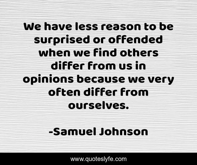 This page presents the quote "We have less reason to be surprised or offended when we find others differ from us in opinions because we very often differ from ourselves.". Author of this quote is Samuel Johnson. This quote is about graciousness, humility,.
