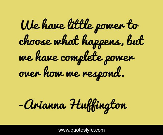 This page presents the quote "We have little power to choose what happens, but we have complete power over how we respond.". Author of this quote is Arianna Huffington. This quote is about reaction, self-peace, power,.