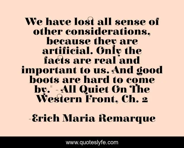This page presents the quote "We have lost all sense of other considerations, because they are artificial. Only the facts are real and important to us. And good boots are hard to come by." - All Quiet On The Western Front, Ch. 2". Author of this quote is Erich Maria Remarque. .