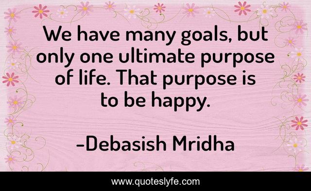 This page presents the quote "We have many goals, but only one ultimate purpose of life. That purpose is to be happy.". Author of this quote is Debasish Mridha. This quote is about life-goals, philosophy, debasish-mridha, be-happy, quotes, inspirational, enthusiasm, purpose-of-life, debasish-mridha-m-d,.