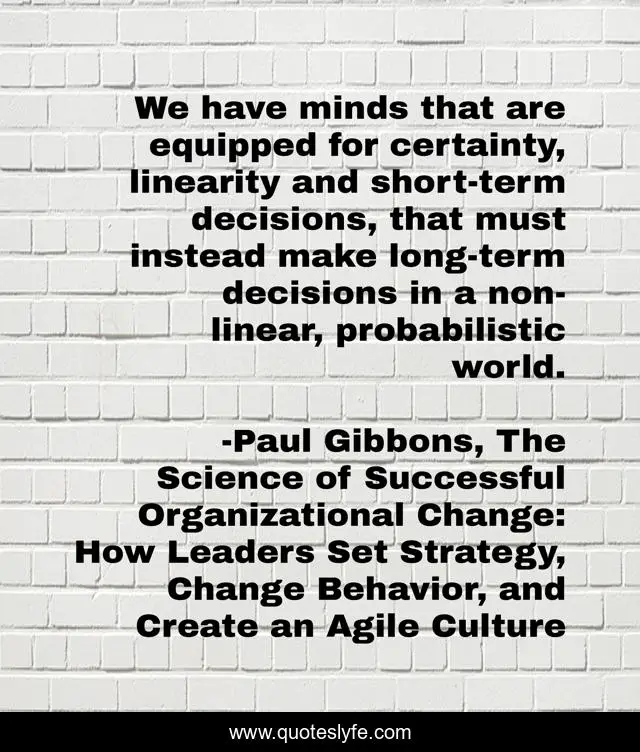 This page presents the quote "We have minds that are equipped for certainty, linearity and short-term decisions, that must instead make long-term decisions in a non-linear, probabilistic world.". Author of this quote is Paul Gibbons, The Science of Successful Organizational Change: How Leaders Set Strategy, Change Behavior, and Create an Agile Culture. This quote is about systems-thinking, risk, uncertainty, leadership, neuroscience, science-and-change, change-management,.