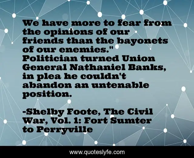 This page presents the quote "We have more to fear from the opinions of our friends than the bayonets of our enemies." Politician turned Union General Nathaniel Banks, in plea he couldn't abandon an untenable position.". Author of this quote is Shelby Foote, The Civil War, Vol. 1: Fort Sumter to Perryville. This quote is about peer-pressure, independence,.