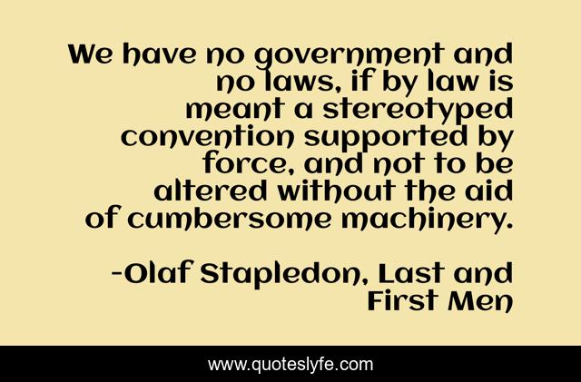 This page presents the quote "We have no government and no laws, if by law is meant a stereotyped convention supported by force, and not to be altered without the aid of cumbersome machinery.". Author of this quote is Olaf Stapledon, Last and First Men. .
