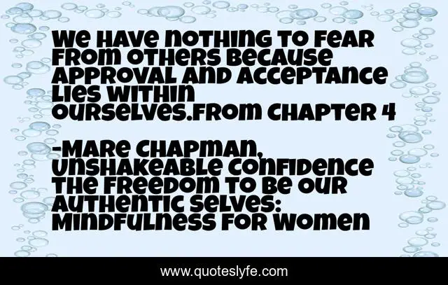 This page presents the quote "We have nothing to fear from others because approval and acceptance lies within ourselves.from Chapter 4". Author of this quote is Mare Chapman, Unshakeable Confidence the Freedom to Be Our Authentic Selves: Mindfulness for Women. This quote is about mindfulness-practice, mindfulness-meditation, self-confidence, women,.
