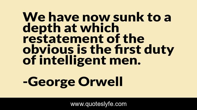 This page presents the quote "We have now sunk to a depth at which restatement of the obvious is the first duty of intelligent men.". Author of this quote is George Orwell. This quote is about duty, intelligence, philosophy, truth, progress,.