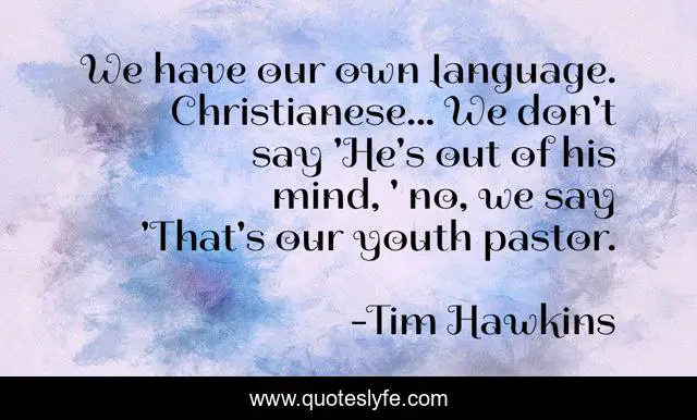 This page presents the quote "We have our own language. Christianese... We don't say 'He's out of his mind, ' no, we say 'That's our youth pastor.". Author of this quote is Tim Hawkins. This quote is about humor, language, christianity,.