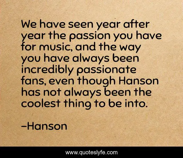This page presents the quote "We have seen year after year the passion you have for music, and the way you have always been incredibly passionate fans, even though Hanson has not always been the coolest thing to be into.". Author of this quote is Hanson. This quote is about hanson, fans, music, the-walk,.