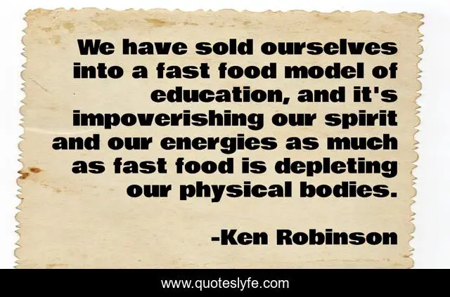 This page presents the quote "We have sold ourselves into a fast food model of education, and it's impoverishing our spirit and our energies as much as fast food is depleting our physical bodies.". Author of this quote is Ken Robinson. This quote is about education, creativity, fast-food,.