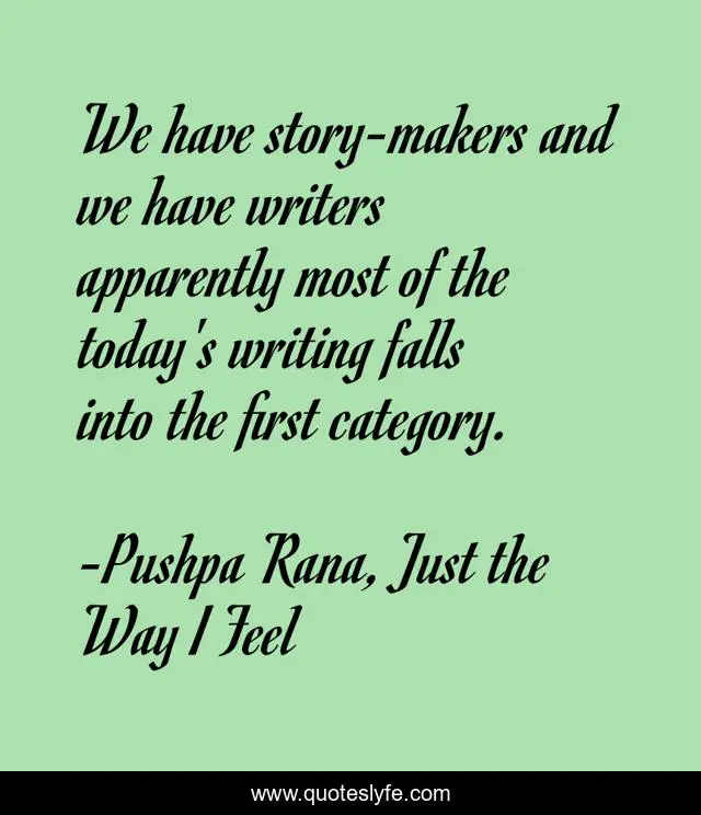This page presents the quote "We have story-makers and we have writers apparently most of the today's writing falls into the first category.". Author of this quote is Pushpa Rana, Just the Way I Feel. This quote is about story, feelings, writers, stories, writing, story-makers,.