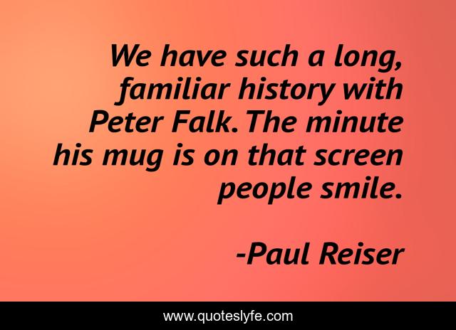 This page presents the quote "We have such a long, familiar history with Peter Falk. The minute his mug is on that screen people smile.". Author of this quote is Paul Reiser. This quote is about history, long, people,.