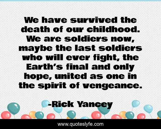 This page presents the quote "We have survived the death of our childhood. We are soldiers now, maybe the last soldiers who will ever fight, the Earth’s final and only hope, united as one in the spirit of vengeance.". Author of this quote is Rick Yancey. This quote is about soldiers, survival, dystopian, hope,.