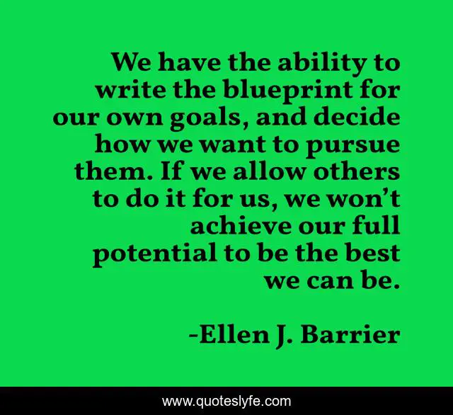 This page presents the quote "We have the ability to write the blueprint for our own goals, and decide how we want to pursue them. If we allow others to do it for us, we won’t achieve our full potential to be the best we can be.". Author of this quote is Ellen J. Barrier. This quote is about blueprint, goals,.