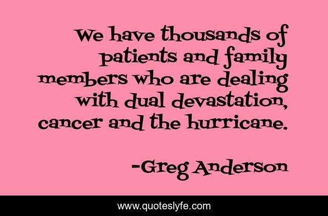 This page presents the quote "We have thousands of patients and family members who are dealing with dual devastation, cancer and the hurricane.". Author of this quote is Greg Anderson. This quote is about dealing, hurricane, cancer,.