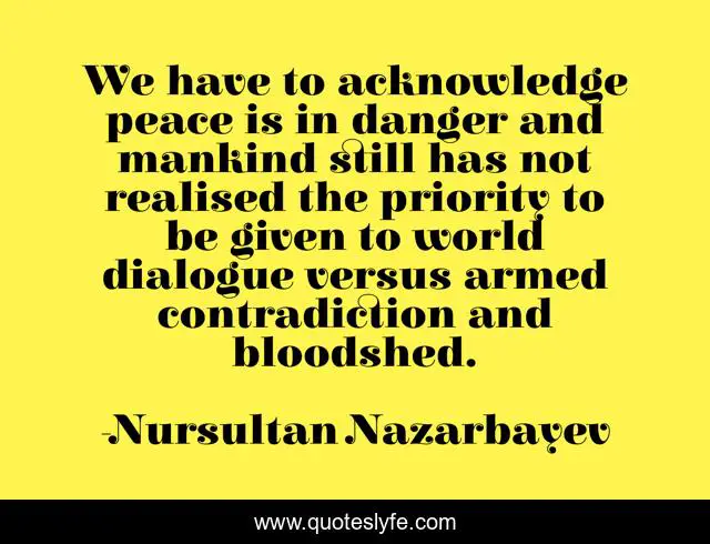 This page presents the quote "We have to acknowledge peace is in danger and mankind still has not realised the priority to be given to world dialogue versus armed contradiction and bloodshed.". Author of this quote is Nursultan Nazarbayev. This quote is about world, dialogue, danger,.