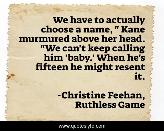 This page presents the quote "We have to actually choose a name, " Kane murmured above her head. "We can't keep calling him 'baby.' When he's fifteen he might resent it.". Author of this quote is Christine Feehan, Ruthless Game. This quote is about humor, children, babies,.