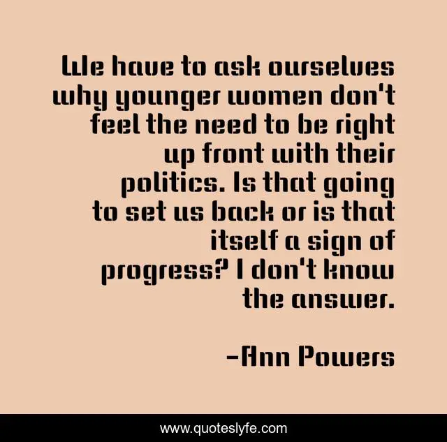This page presents the quote "We have to ask ourselves why younger women don't feel the need to be right up front with their politics. Is that going to set us back or is that itself a sign of progress? I don't know the answer.". Author of this quote is Ann Powers. This quote is about progress, women,.
