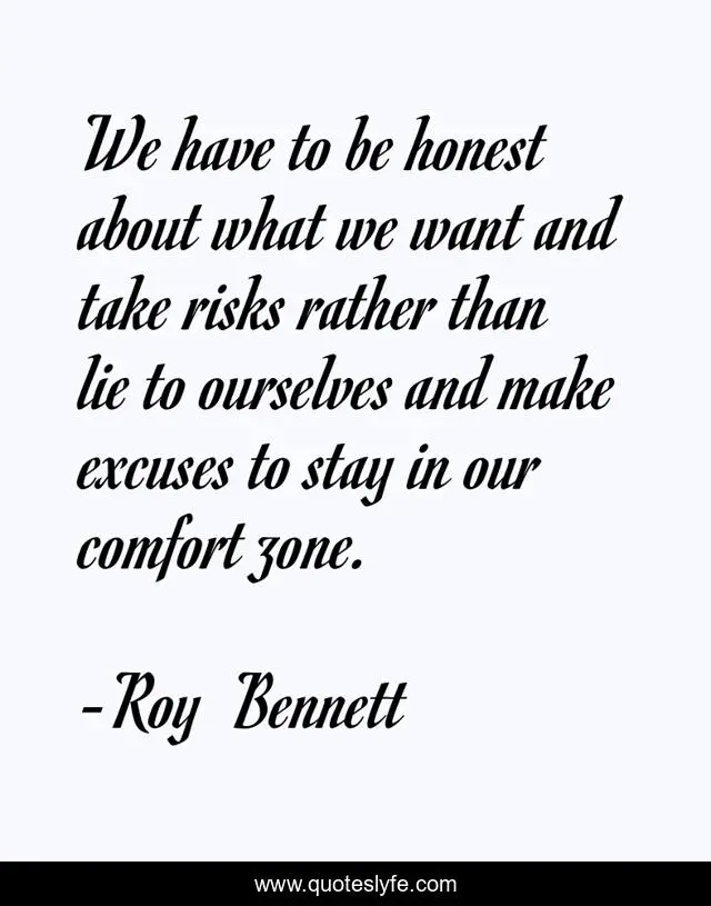 This page presents the quote "We have to be honest about what we want and take risks rather than lie to ourselves and make excuses to stay in our comfort zone.". Author of this quote is Roy Bennett. This quote is about life, honesty, character, leadership, inspirational, comfort-zone, take-risks, enthusiasm, integrity,.