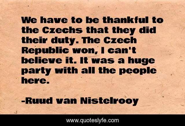This page presents the quote "We have to be thankful to the Czechs that they did their duty. The Czech Republic won, I can't believe it. It was a huge party with all the people here.". Author of this quote is Ruud van Nistelrooy. This quote is about believe, be thankful, people,.