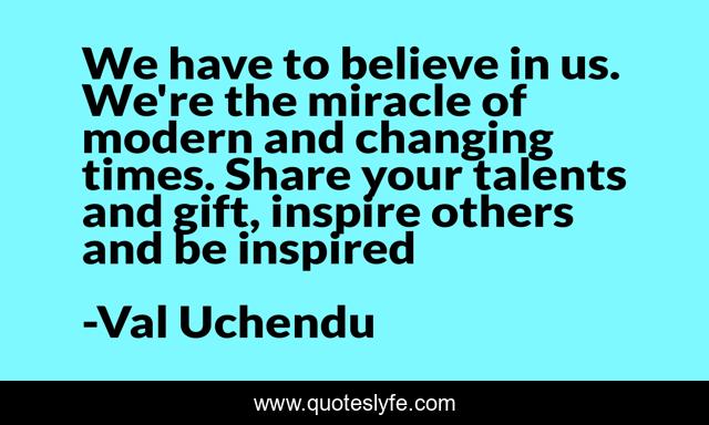 This page presents the quote "We have to believe in us. We're the miracle of modern and changing times. Share your talents and gift, inspire others and be inspired". Author of this quote is Val Uchendu. This quote is about miracles, loss, talent, gift, profound, believe-in-yourself, inspired, modern, profound-love,.