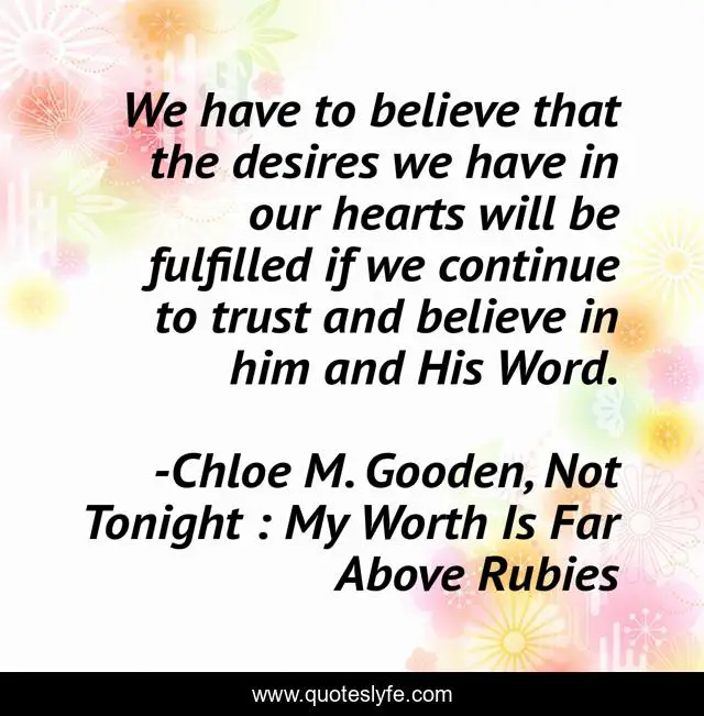 This page presents the quote "We have to believe that the desires we have in our hearts will be fulfilled if we continue to trust and believe in him and His Word.". Author of this quote is Chloe M. Gooden, Not Tonight : My Worth Is Far Above Rubies. This quote is about god, desires, trusting-god,.
