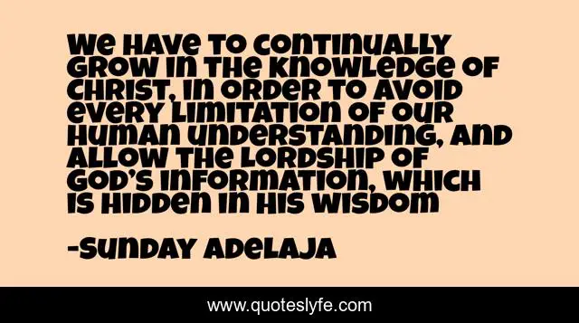 This page presents the quote "We have to continually grow in the knowledge of Christ, in order to avoid every limitation of our human understanding, and allow the Lordship of God’s information, which is hidden in His wisdom". Author of this quote is Sunday Adelaja. This quote is about information, limitation, christ, prosperity, money, avoid, riches, reality-of-life, understanding,.