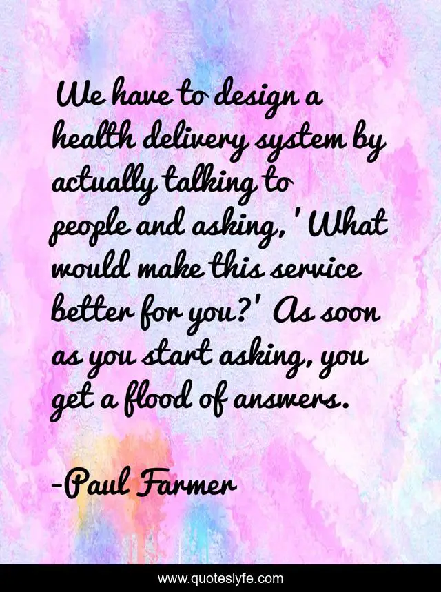 This page presents the quote "We have to design a health delivery system by actually talking to people and asking, 'What would make this service better for you?' As soon as you start asking, you get a flood of answers.". Author of this quote is Paul Farmer. This quote is about health, service, people,.