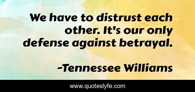 This page presents the quote "We have to distrust each other. It's our only defense against betrayal.". Author of this quote is Tennessee Williams. This quote is about distrust, betrayal,.