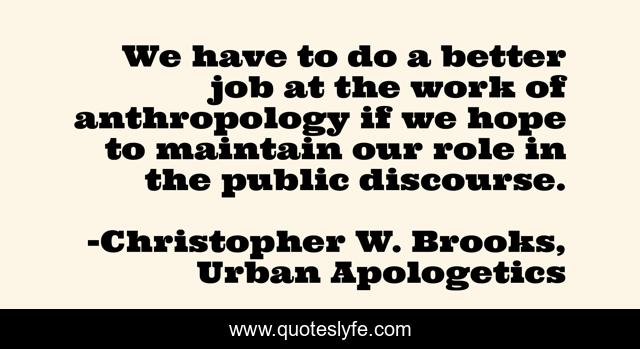 This page presents the quote "We have to do a better job at the work of anthropology if we hope to maintain our role in the public discourse.". Author of this quote is Christopher W. Brooks, Urban Apologetics. This quote is about urban-apologetics, apologetics, christianity,.