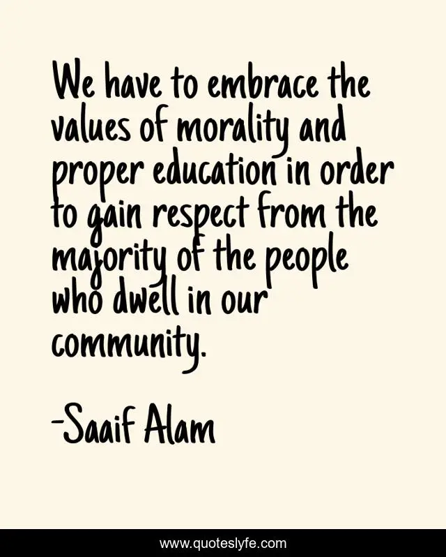 This page presents the quote "We have to embrace the values of morality and proper education in order to gain respect from the majority of the people who dwell in our community.". Author of this quote is Saaif Alam. This quote is about education, moral-values,.