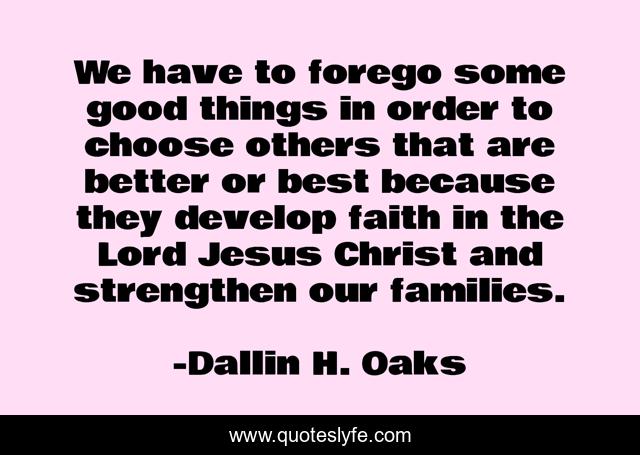 This page presents the quote "We have to forego some good things in order to choose others that are better or best because they develop faith in the Lord Jesus Christ and strengthen our families.". Author of this quote is Dallin H. Oaks. This quote is about spirit, family, time,.