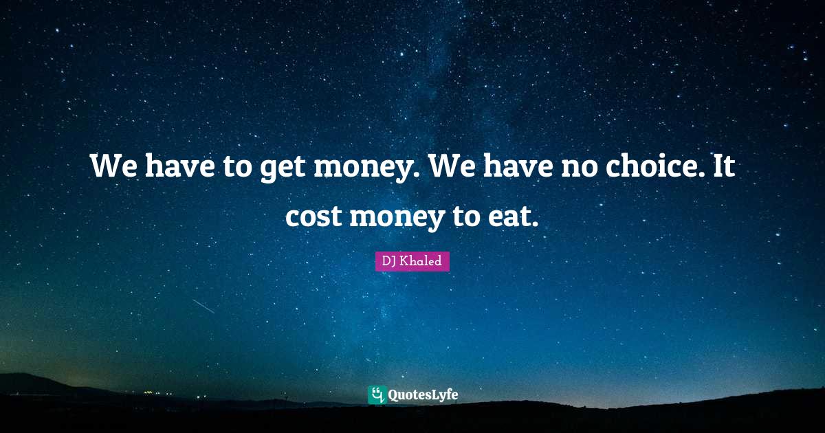 This page presents the quote "We have to get money. We have no choice. It cost money to eat.". Author of this quote is DJ Khaled. This quote is about choices, money, get money, cost,.
