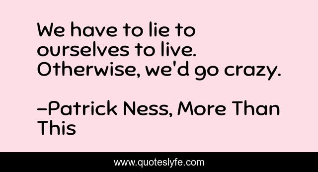 This page presents the quote "We have to lie to ourselves to live. Otherwise, we'd go crazy.". Author of this quote is Patrick Ness, More Than This. This quote is about lie, life,.