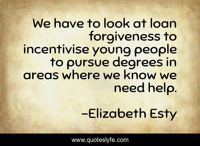 This page presents the quote "We have to look at loan forgiveness to incentivise young people to pursue degrees in areas where we know we need help.". Author of this quote is Elizabeth Esty. This quote is about help, people,.