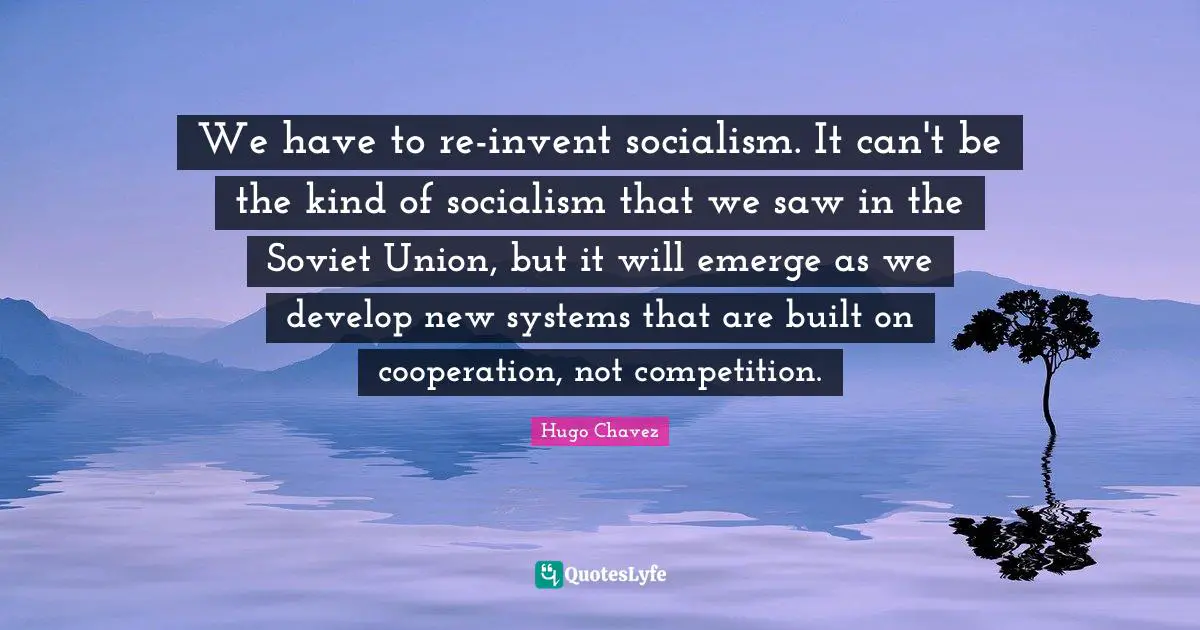 This page presents the quote "We have to re-invent socialism. It can't be the kind of socialism that we saw in the Soviet Union, but it will emerge as we develop new systems that are built on cooperation, not competition.". Author of this quote is Hugo Chavez. This quote is about built, socialism, unions, soviet union, competition, saws, cooperation, kind,.