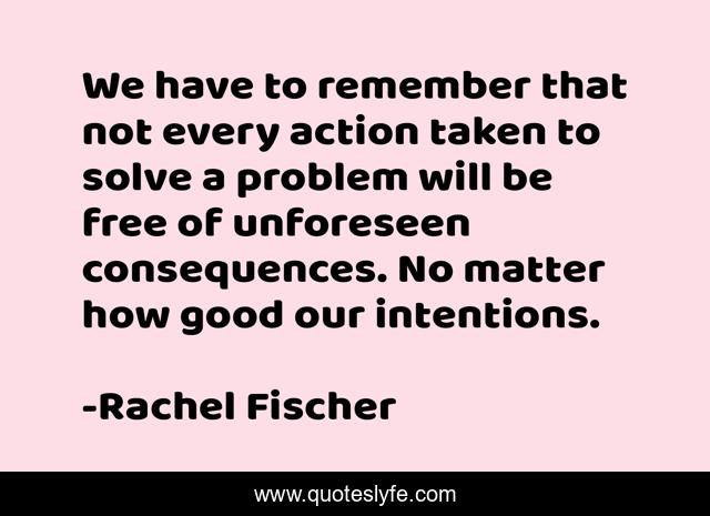 This page presents the quote "We have to remember that not every action taken to solve a problem will be free of unforeseen consequences. No matter how good our intentions.". Author of this quote is Rachel Fischer. This quote is about food, problems, rachel-fischer,.