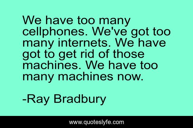 This page presents the quote "We have too many cellphones. We've got too many internets. We have got to get rid of those machines. We have too many machines now.". Author of this quote is Ray Bradbury. This quote is about simplicity, internets, aversion, technology, humanity, machines,.