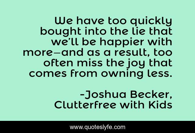This page presents the quote "We have too quickly bought into the lie that we’ll be happier with more—and as a result, too often miss the joy that comes from owning less.". Author of this quote is Joshua Becker, Clutterfree with Kids. This quote is about consumerism, happiness, materialism,.