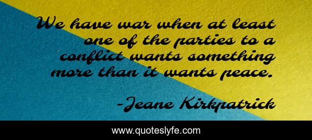 This page presents the quote "We have war when at least one of the parties to a conflict wants something more than it wants peace.". Author of this quote is Jeane Kirkpatrick. This quote is about peace, something, conflict,.