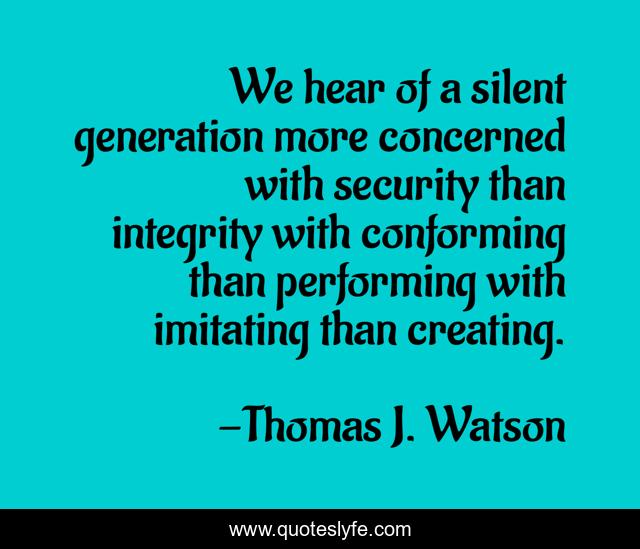 This page presents the quote "We hear of a silent generation more concerned with security than integrity with conforming than performing with imitating than creating.". Author of this quote is Thomas J. Watson. .