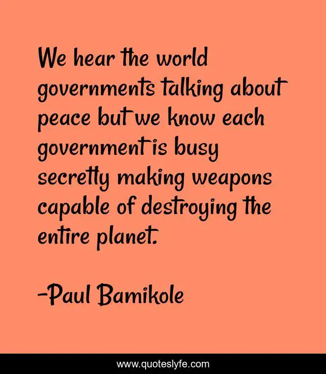 This page presents the quote "We hear the world governments talking about peace but we know each government is busy secretly making weapons capable of destroying the entire planet.". Author of this quote is Paul Bamikole. This quote is about planet, busy, government, secrets, peace, nations, weapons, destroy, earth,.