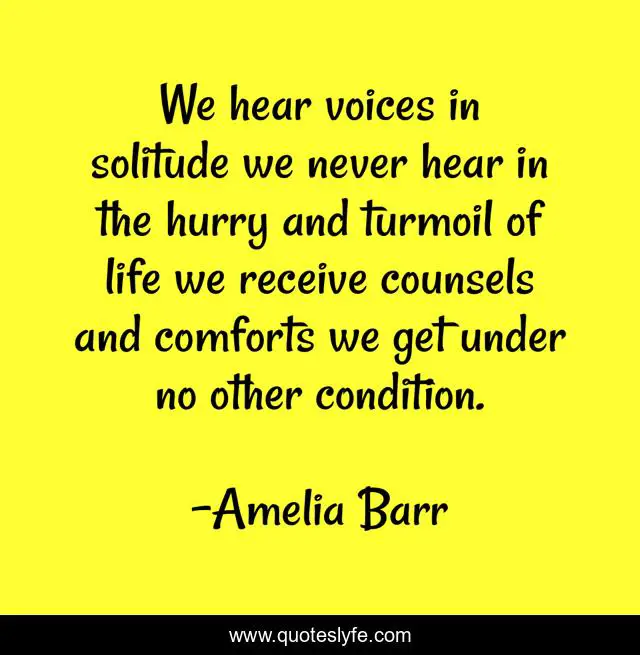 This page presents the quote "We hear voices in solitude we never hear in the hurry and turmoil of life we receive counsels and comforts we get under no other condition.". Author of this quote is Amelia Barr. .