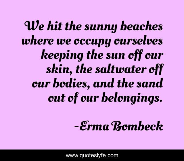 This page presents the quote "We hit the sunny beaches where we occupy ourselves keeping the sun off our skin, the saltwater off our bodies, and the sand out of our belongings.". Author of this quote is Erma Bombeck. This quote is about humor, sand, saltwater, beaches, sun,.